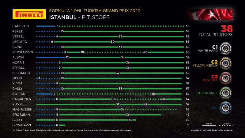 A Pirelli infografikájáról leolvasható, hogy sáfárkodott a 10 versenyző az esős (kék) és intermediate (zöld) abroncson. Hamilton győzelmében közreműködött, hogy második csere nélkül 50 kört húzott le az átmeneti abroncson, míg – a pontszerzők közül egyedül a második Perezt leszámítva – mindenki más két cserére voksolt. Verstappen, megforgása miatt kényszerűségből, háromszor is kiállt. Russell és Latifi taktikája elüt a többiekétől, a két Williams köztes gumin kezdett a bokszból.